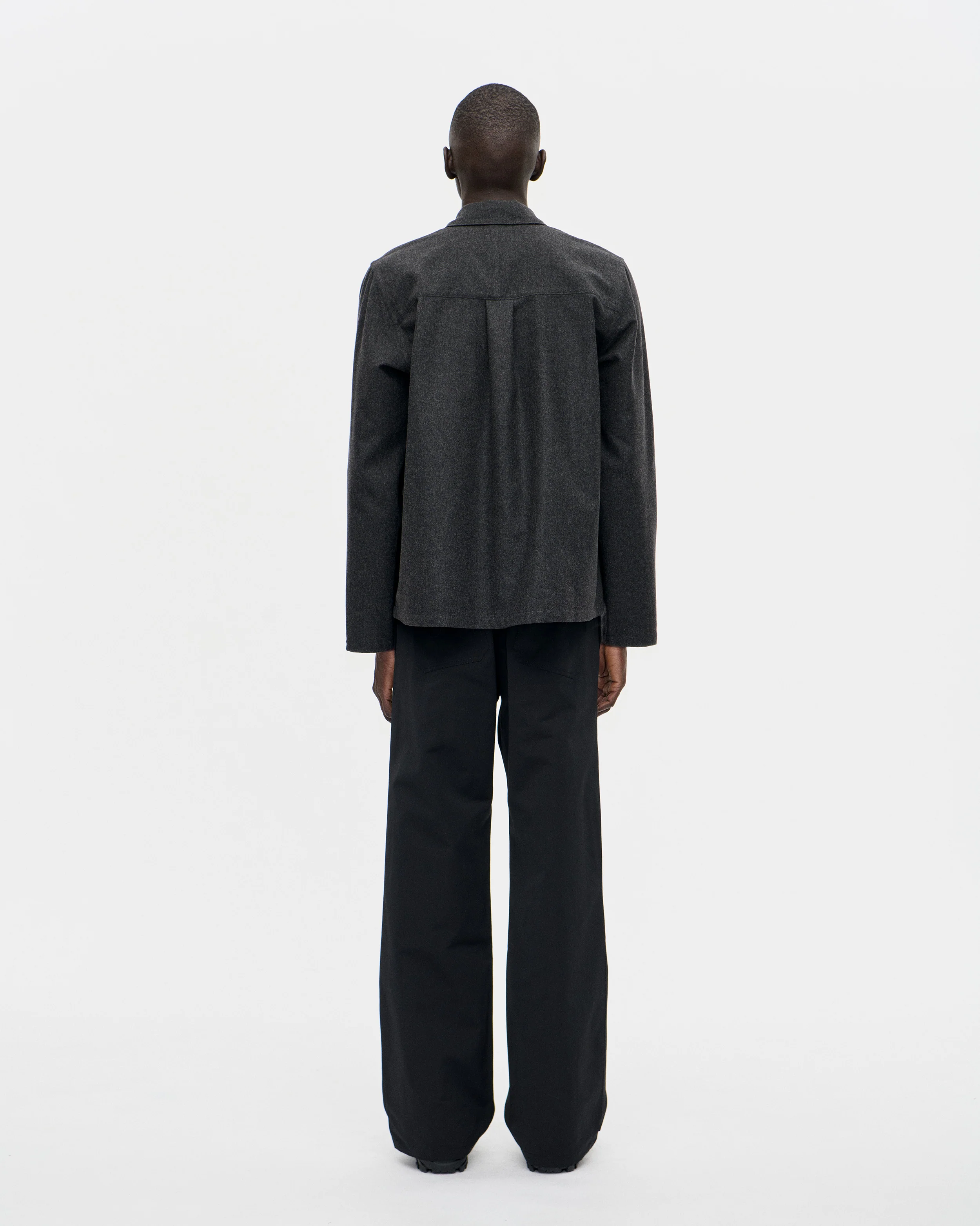 Cordial Shirt Biella is made in a deadstock virgin wool/nylon flannel blend. The Cordial Shirt has a boxy fit, features dark grey real mother pearl buttons and a straight hem.