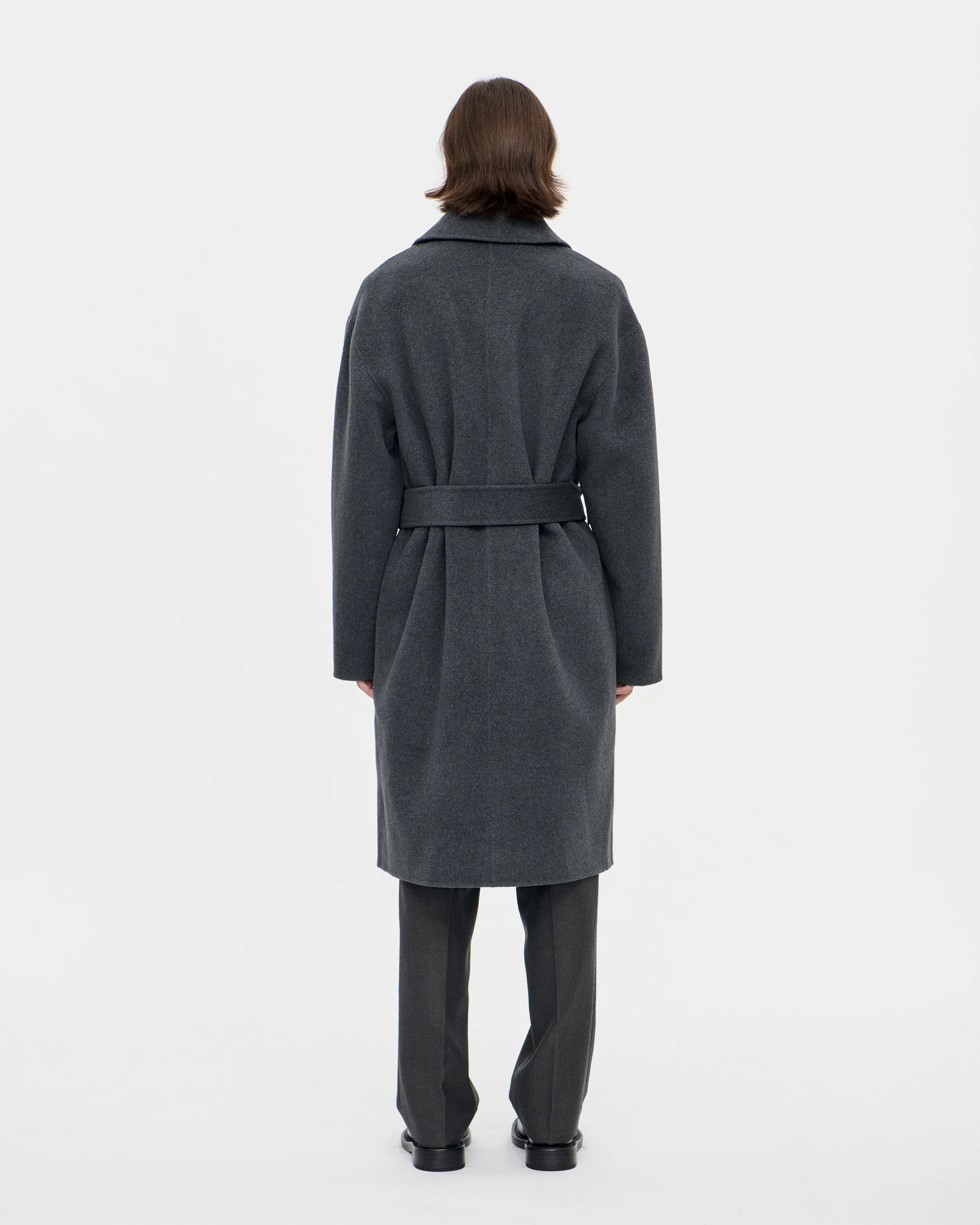 A double faced wool/cashmere blend coat with a soft lush handfeel. Made in a relaxed a shape fit with a slightly dropped shoulder and a removable belt in waist. Features hidden pockets in side seam on front and closes with real horn logo buttons. Unlined body construction with drop lining in sleeves.Â