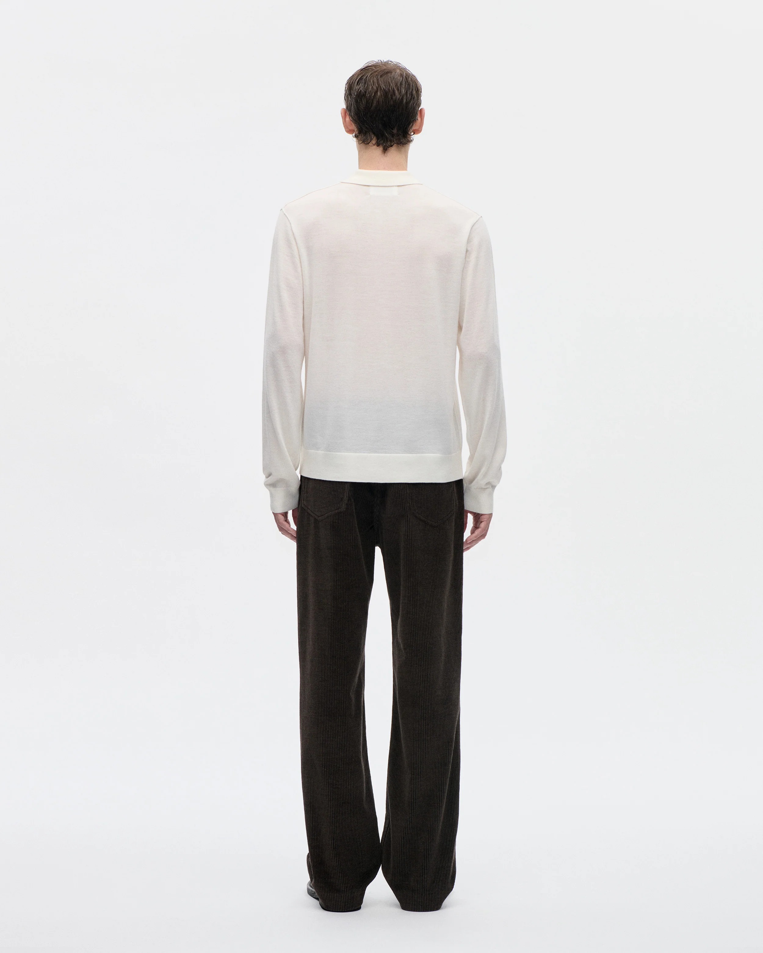 Our classic knit polo is a made in a soft merino wool yarn, knit on an extra fine 16gg machine. It is made with rib finishing on bottom and cuff sleeve. Collar is knit in a milano stitch. Regular fit. Inside out seam detail on shoulder armhole. Real mother of pearl buttons.