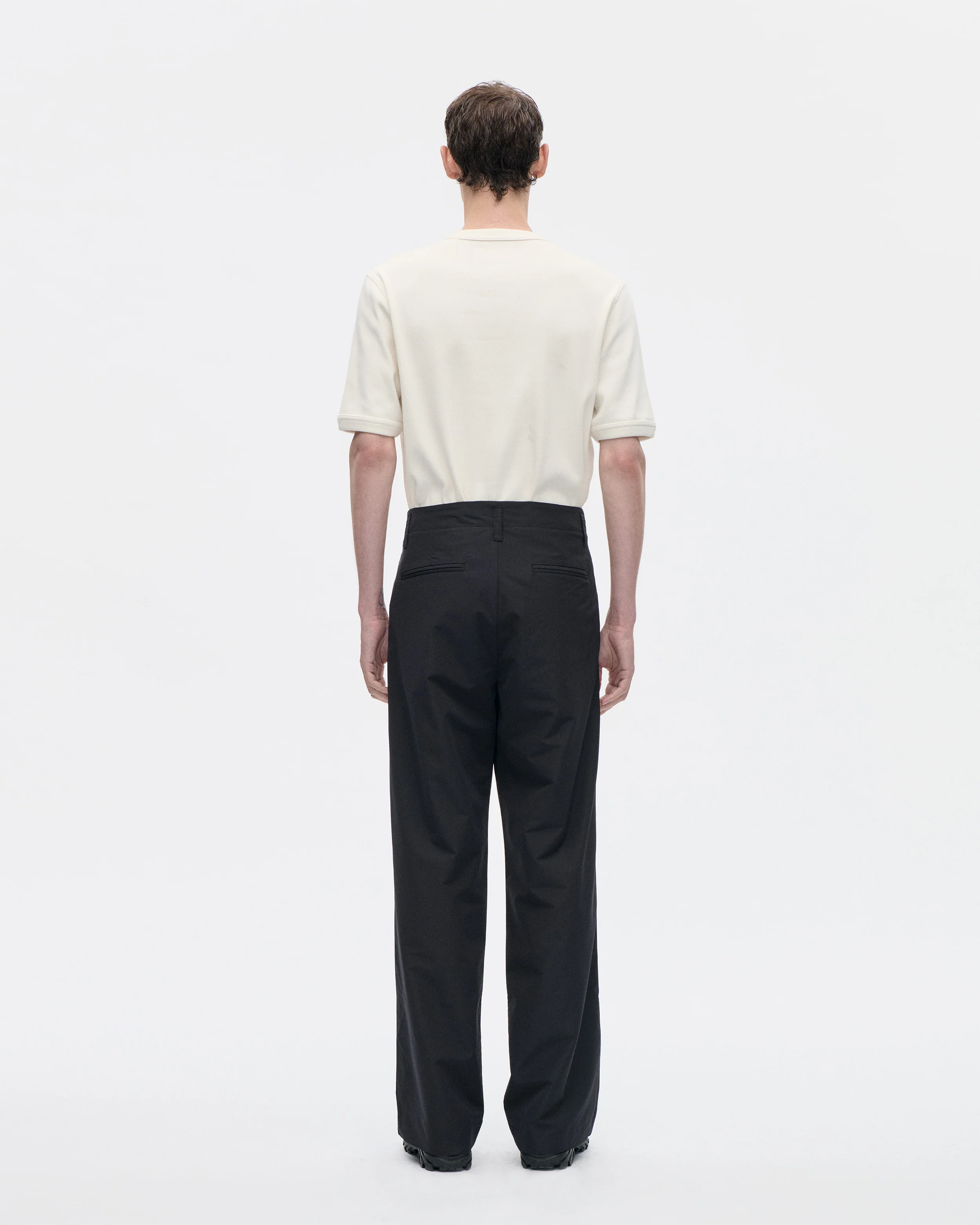 Produced in a technical deadstock Loro Piana wool/nylon fabric. The Sargeant pant has a straight wide leg and features zip fly, two side pockets, two welt back pockets, and hook and bar closure. Made with blind hem stitch.